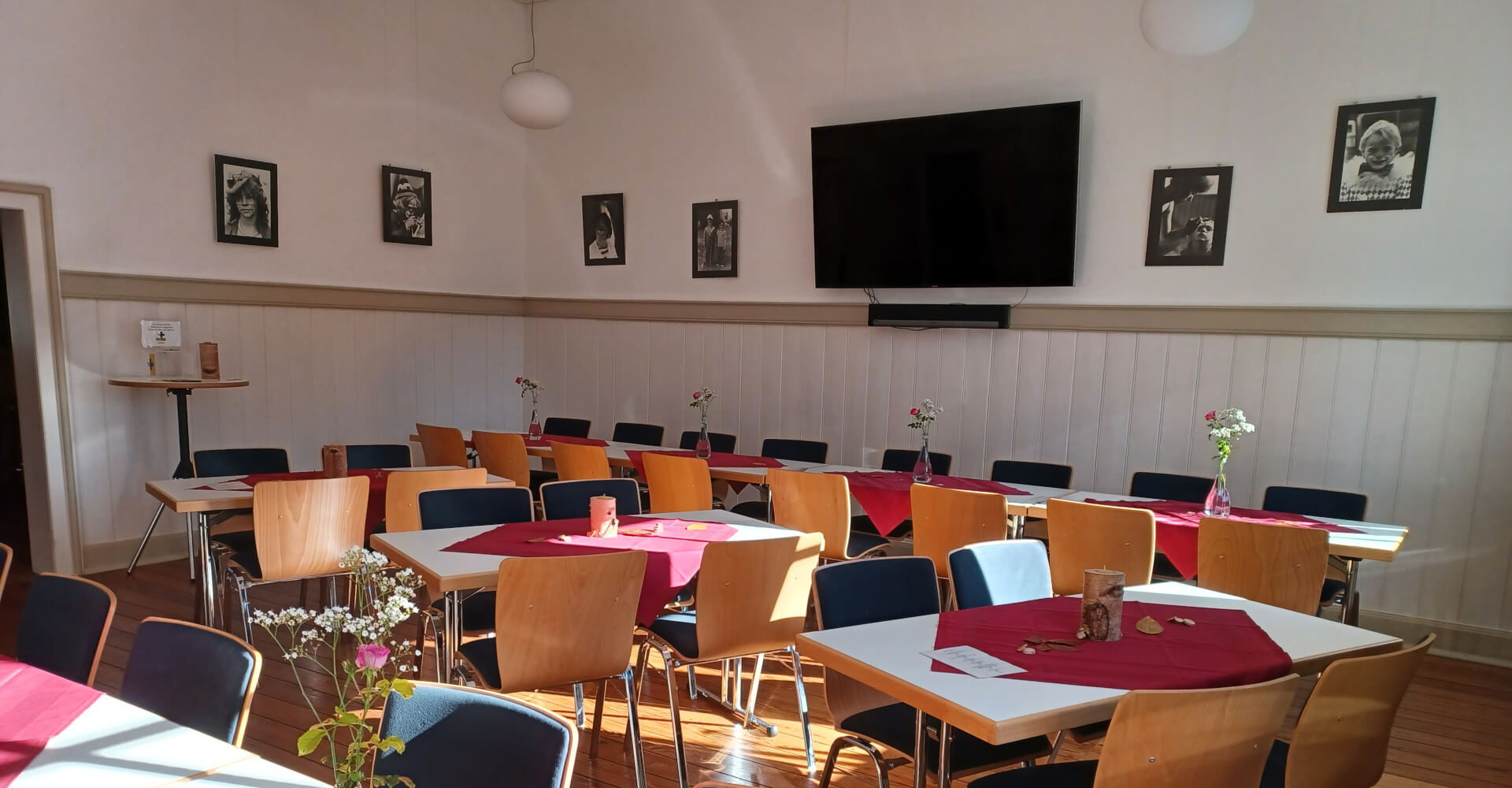 Der perfekte Saal für Feiern ab 30 Personen, unbestuhlt als Dancefloor nutzbar, wird oft zusammen gebucht mit der Burgmann-Klause, sehr gut geeignet für Kreativ- und Gesundheitskurse.